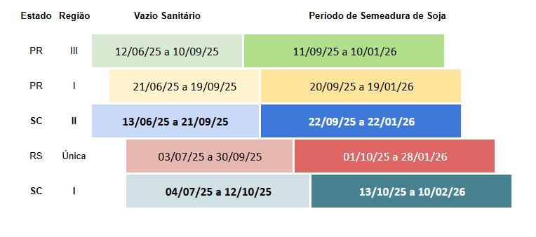 A definição das datas ocorre logo após o encerramento do vazio sanitário da soja na Região II de Santa Catarina, que terminou em 21 de setembro. Esse período, em que não é permitida a manutenção de plantas vivas no campo, tem como objetivo interromper o ciclo da ferrugem asiática (Phakopsora pachyrhizi), considerada uma das doenças mais severas e prejudiciais à cultura.