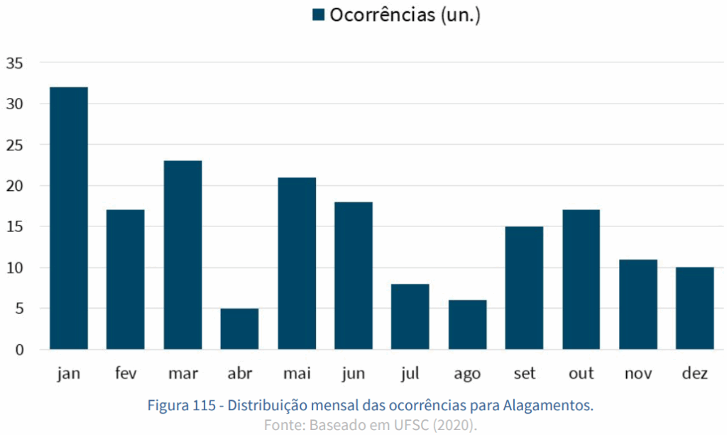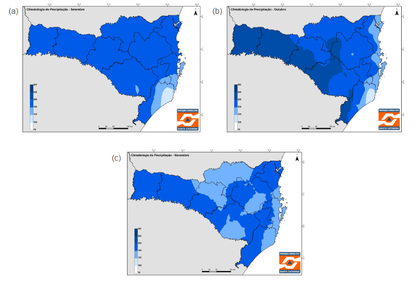 Levantamento do Perfil Histórico de Desastres do Plano Estadual de Proteção e Defesa Civil de Santa Catarina (PPDC-SC), que analisou 29 anos de registros (1995-2019) e 5.540 ocorrências, mostra que os períodos de chuvas mais intensas concentram-se entre setembro e março.