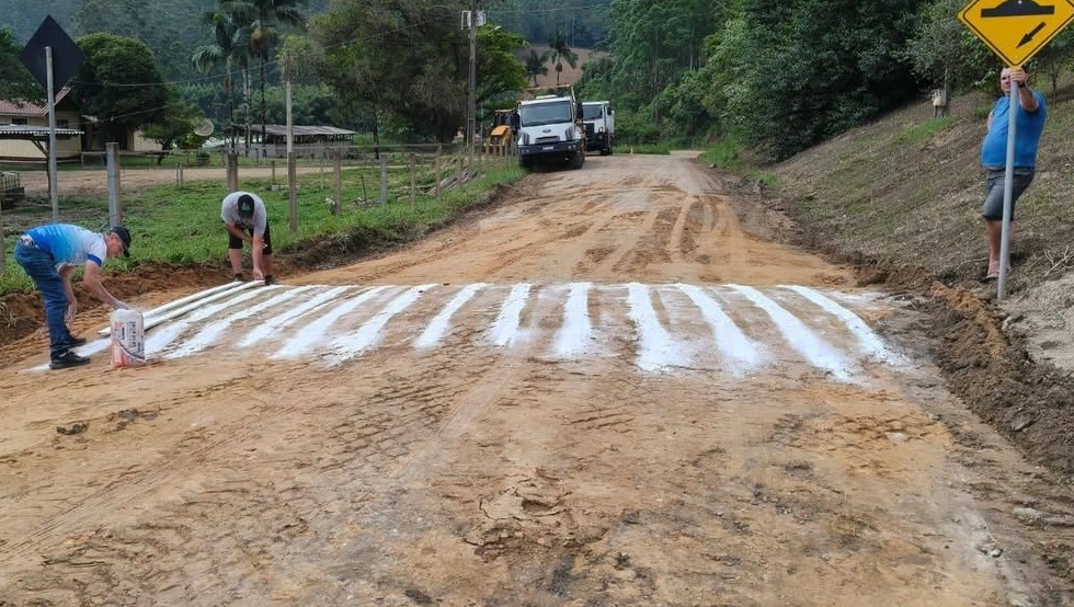 A Prefeitura de José Boiteux, no Vale do Itajaí (SC), chamou atenção nas redes sociais ao divulgar uma obra considerada inusitada: servidores foram flagrados jogando cal branco sobre uma estrada de terra, enquanto anunciavam a construção de lombadas.