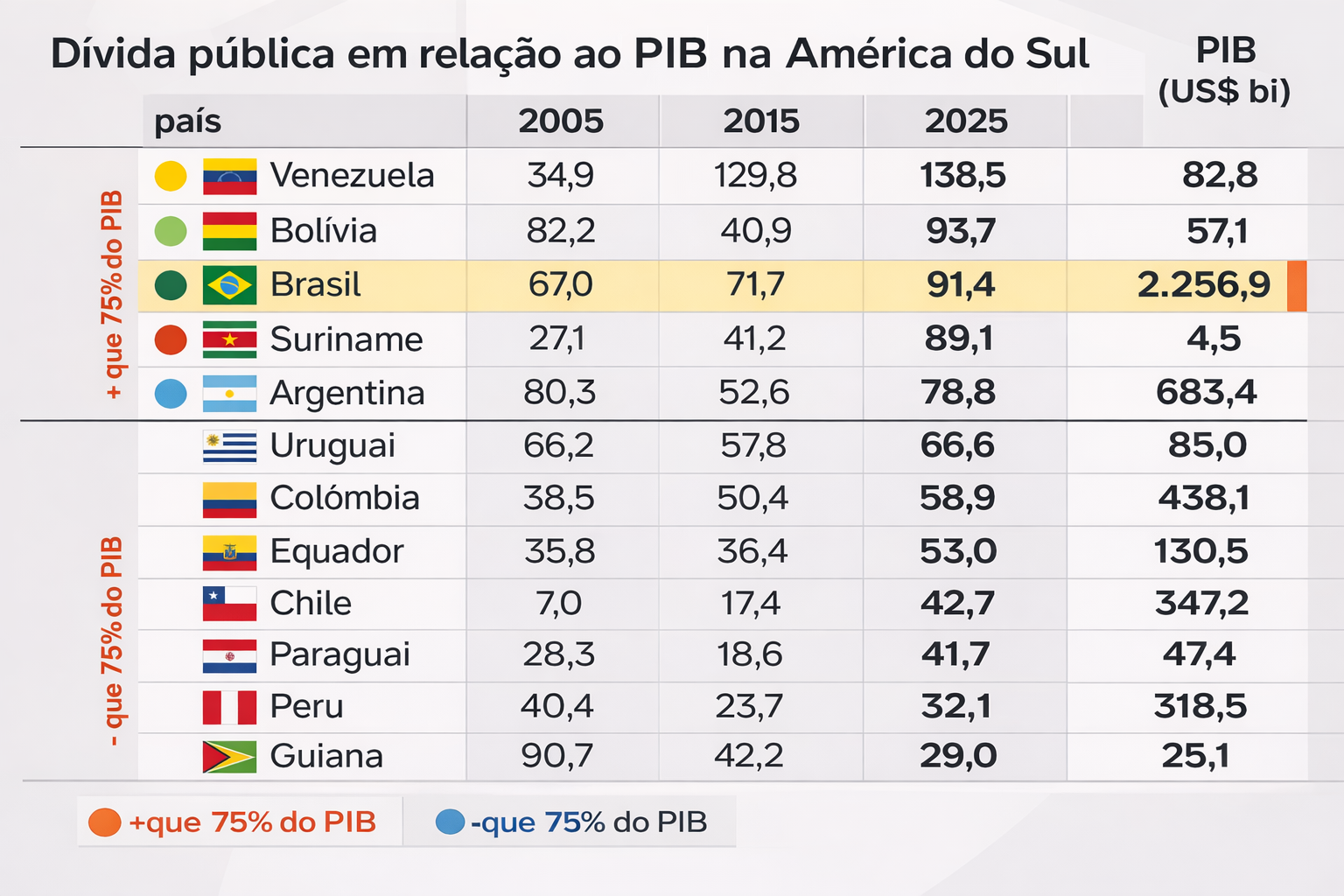 Na comparação com países vizinhos, o Brasil fica atrás apenas de nações com níveis ainda mais elevados de desequilíbrio fiscal, consolidando-se entre os mais endividados do continente. O dado reforça preocupações de analistas sobre a trajetória da dívida e seus impactos no crescimento econômico.