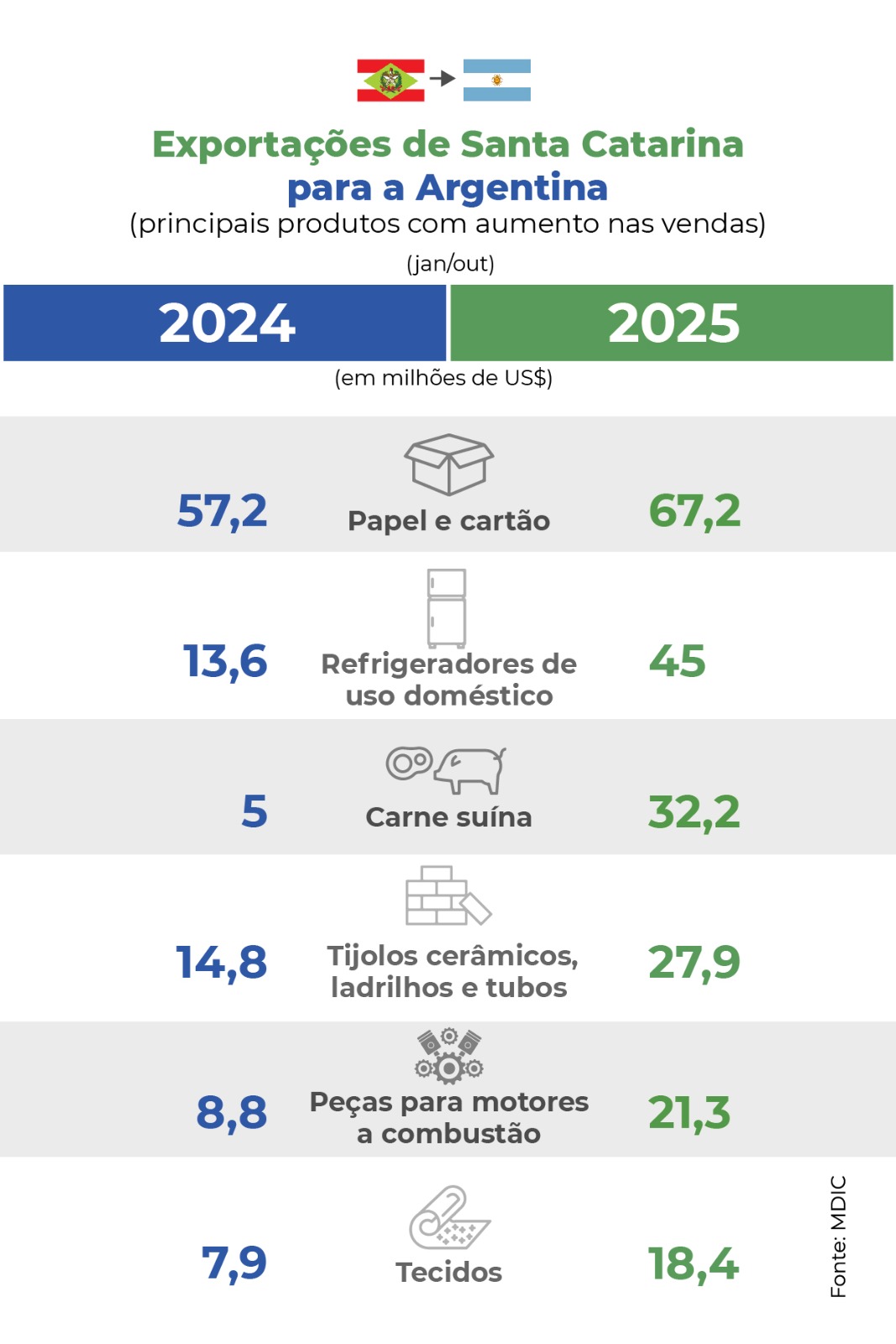 “O aumento de 25% nas exportações para a Argentina reflete o bom desempenho de diversos setores, desde o agro, metalmecânico, têxtil, bem como construção civil. Santa Catarina produz com excelência em diversos setores e isso impulsiona o estado”, destaca.