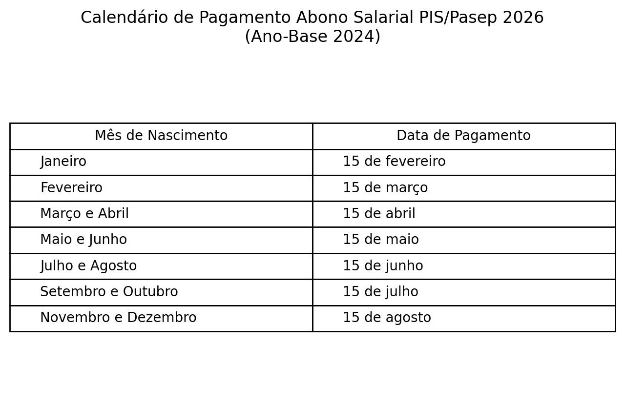 Em 2026, o calendário de pagamentos segue unificado e baseado no mês de nascimento do beneficiário. Os valores são liberados sempre no dia 15 do mês correspondente ou no primeiro dia útil seguinte, quando a data cair em fim de semana ou feriado.