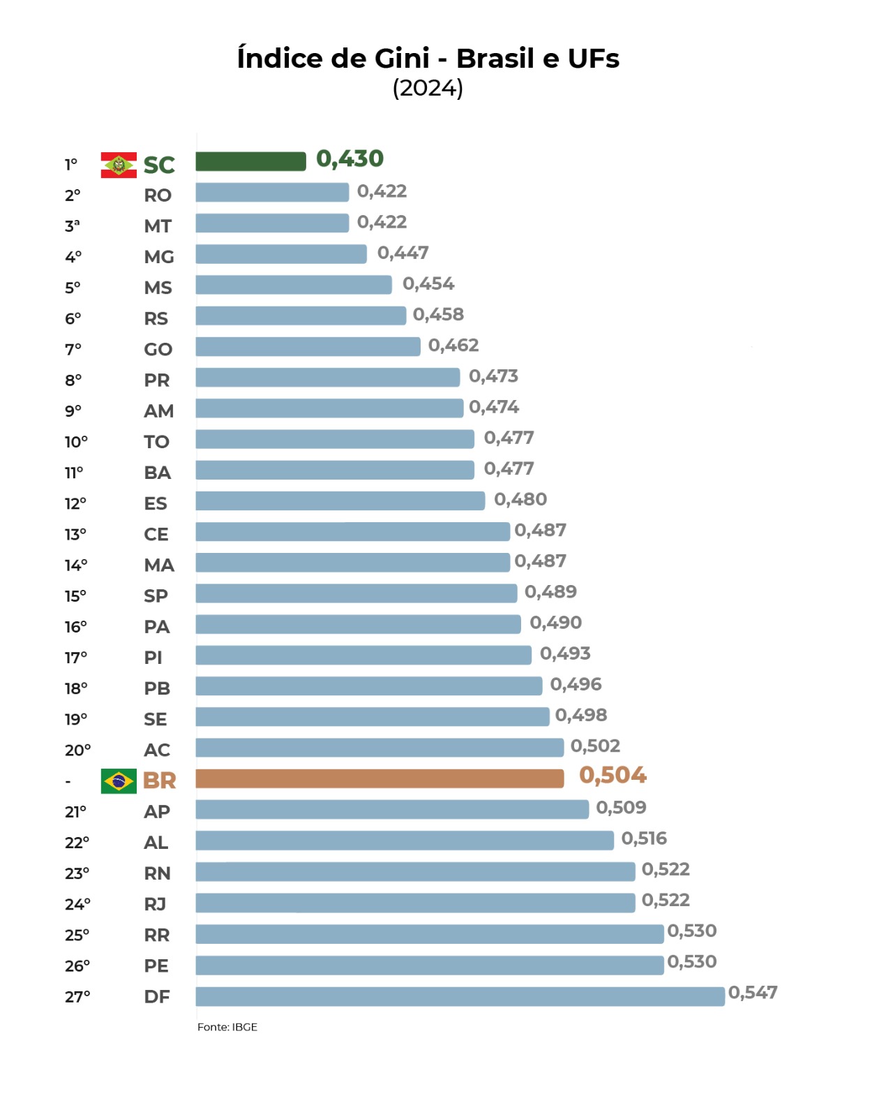 Os dados referentes a 2024 mostram que Santa Catarina atingiu 0,430 no Índice de Gini, resultado que confirma a menor desigualdade de renda do país. Rondônia e Mato Grosso aparecem logo atrás, ambos com 0,442, enquanto a média nacional ficou em 0,504. Para o governador Jorginho Mello, o desempenho é reflexo de políticas que buscam oportunidades em todas as regiões.