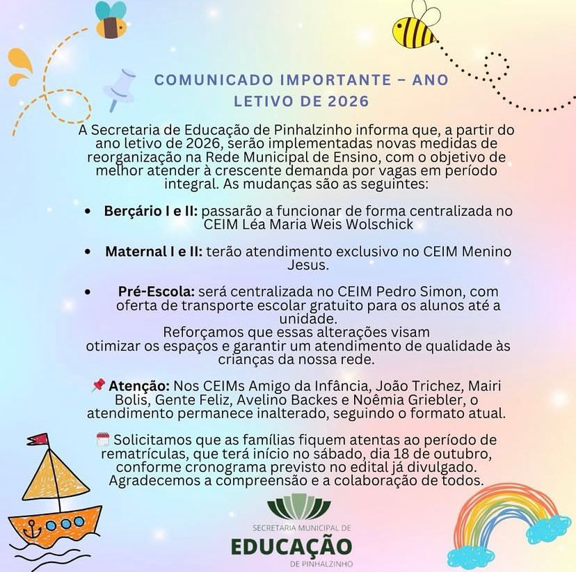 A Secretaria de Educação de Pinhalzinho anunciou uma reorganização na Rede Municipal de Ensino que será implementada a partir do ano letivo de 2026. O objetivo é atender à crescente demanda por vagas em período integral e garantir um atendimento de qualidade para crianças da primeira infância.