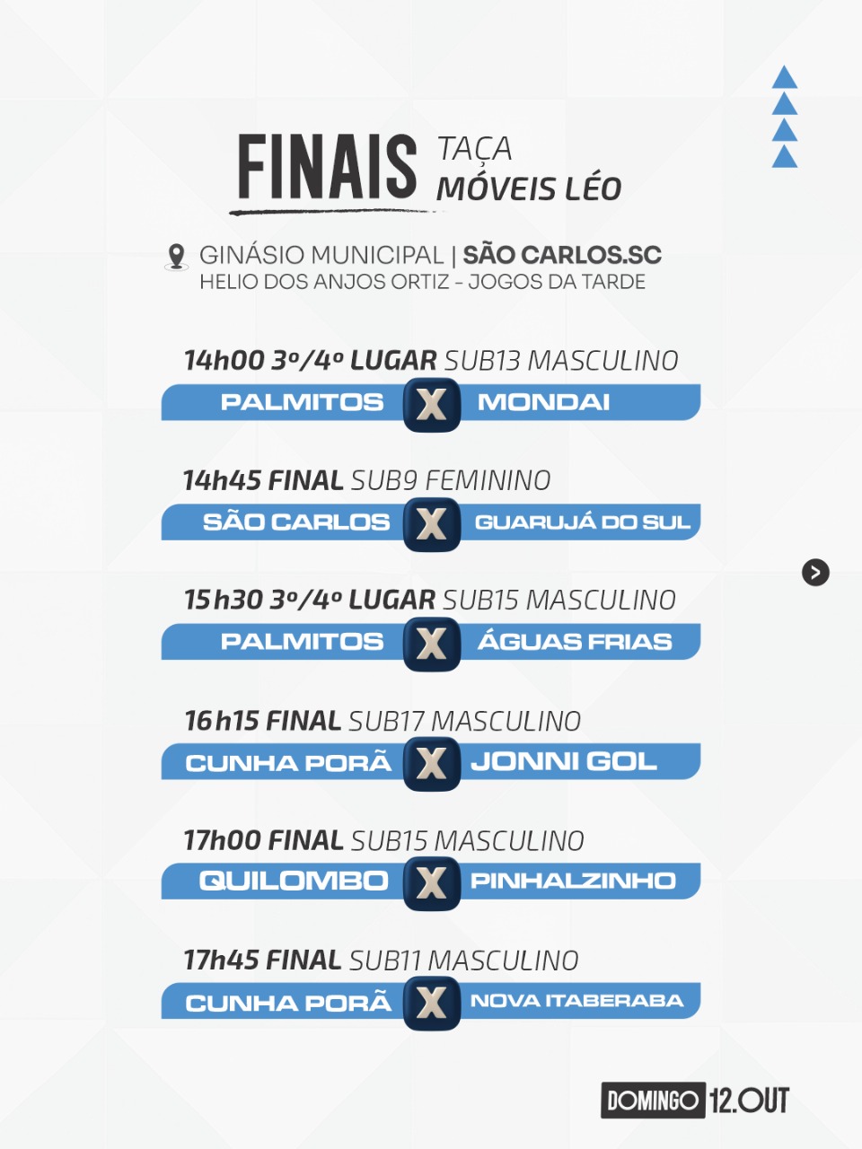 As partidas decisivas acontecem ao longo de todo o domingo, em dois ginásios de São Carlos. Confira abaixo a programação completa dos confrontos: