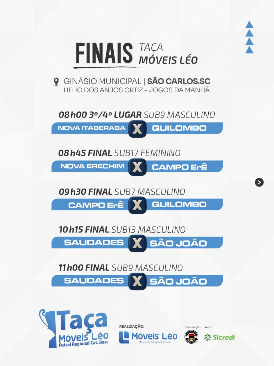 A tradicional Taça Móveis Léo, uma das maiores competições de futsal de base da região, terá suas grandes finais neste domingo (12), em São Carlos. O evento é promovido pela empresa Móveis Léo, com organização da Adesc São Carlos e apoio do Sicredi, reunindo 23 municípios e entidades e um total de 169 equipes participantes.