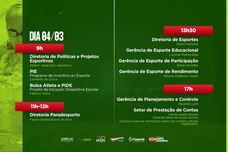 A Fesporte divulgou a programação oficial do 1º Encontro do Sistema Esportivo Catarinense, iniciativa inédita voltada ao fortalecimento e à organização do esporte no Estado.