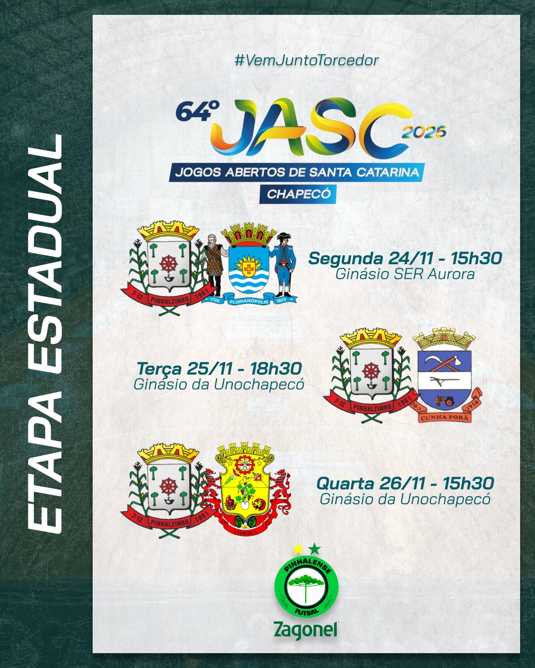A modalidade de futsal masculino dos Jogos Abertos de Santa Catarina, que neste ano é disputado em Chapecó, começa na próxima segunda-feira (24). Pinhalzinho será representado pela Pinhalense Futsal Zagonel, que garantiu a vaga após vencer a Etapa Microrregional e alcançar o 3º lugar no Regional.
