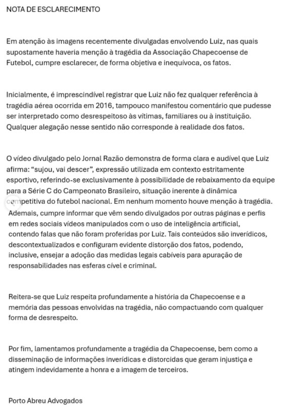 Na nota de esclarecimento, a defesa afirma que não houve qualquer menção à tragédia. Segundo os advogados, a frase proferida foi “sujou, vai descer”, expressão utilizada, conforme o comunicado, em contexto estritamente esportivo, relacionada à possibilidade de rebaixamento para a Série C do Campeonato Brasileiro.