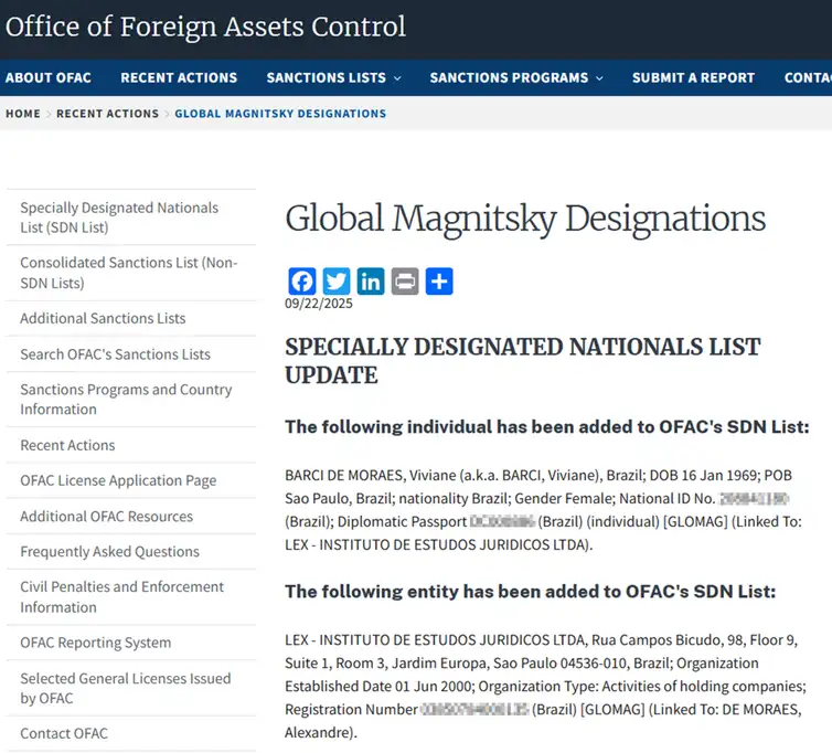 A decisão foi publicada pelo Escritório de Controle de Ativos Estrangeiros (OFAC), órgão do Departamento do Tesouro norte-americano responsável por aplicar medidas desse tipo.