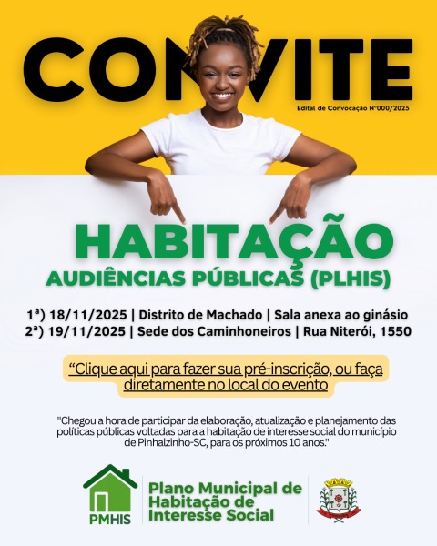 O município de Pinhalzinho, por meio do Departamento Municipal de Habitação, realizará neste mês duas audiências públicas com o objetivo de discutir a elaboração e atualização do Plano Municipal de Habitação de Interesse Social (PMHIS). O plano servirá de base para orientar e estruturar as ações do setor habitacional no município pelos próximos dez anos.