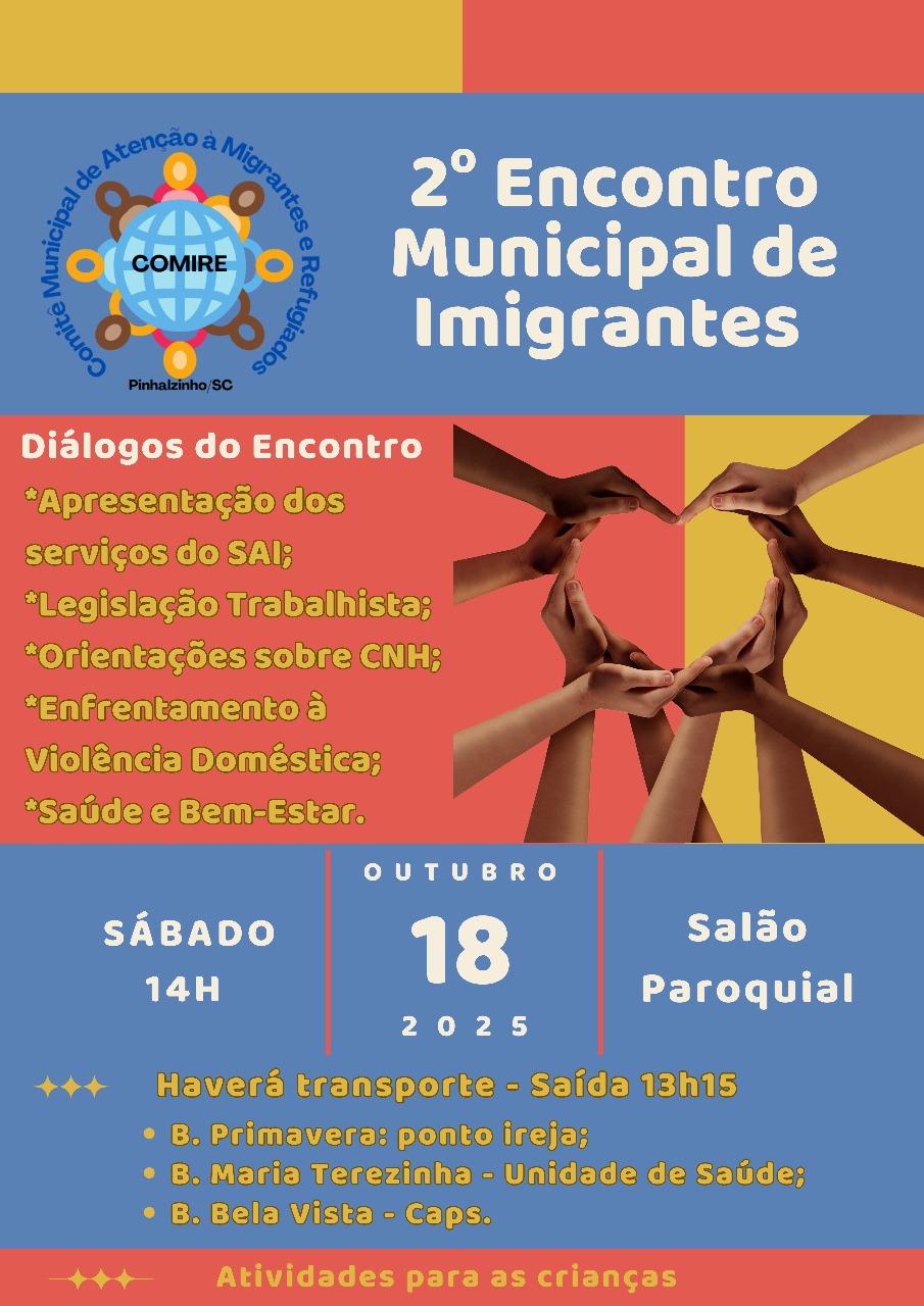 O Comitê Municipal de Atenção a Migrantes e Refugiados (COMIRE), em parceria com a Assistência Social de Pinhalzinho, está convidando todos os imigrantes, refugiados e interessados para o 2º Encontro Municipal de Imigrantes. O evento será realizado no dia 18 de outubro de 2025, a partir das 14h, no Salão Paroquial, anexo à Igreja Matriz.