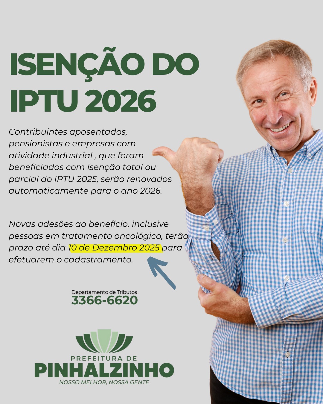 A Prefeitura de Pinhalzinho anunciou que os benefícios de isenção total ou parcial do IPTU 2026 serão renovados automaticamente para aposentados, pensionistas e empresas com atividade industrial. A medida garante continuidade do direito a quem já está contemplado, sem a necessidade de novo cadastro.