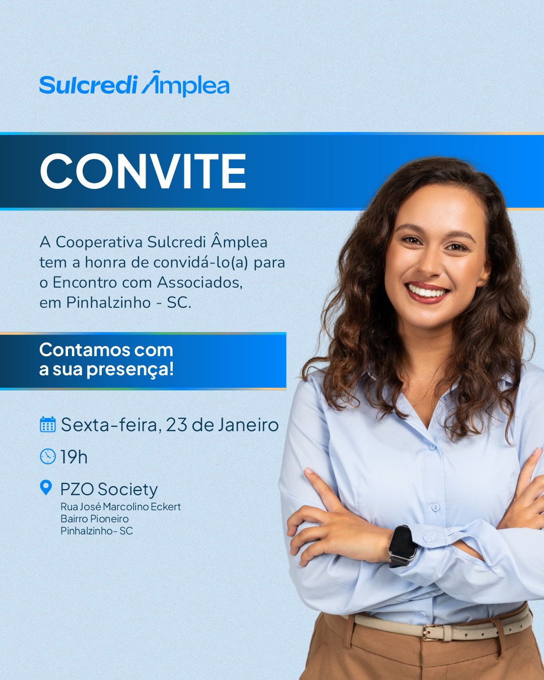A Sulcredi Âmplea realiza no próximo dia 23 de janeiro o Encontro com Associados em Pinhalzinho, iniciativa que marca um ano de atuação da cooperativa no município. O evento será realizado no PZO Society e reunirá associados, convidados e pessoas interessadas em se associar, com o objetivo de apresentar resultados, reforçar a transparência e ampliar a participação dos cooperados nas decisões da instituição.