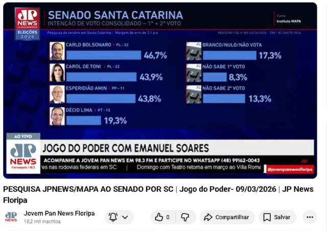 Como a eleição para o Senado permite dois votos por eleitor, o levantamento também avaliou a preferência para a segunda escolha. Neste cenário, Esperidião Amin aparece na liderança com 22,8%. Na sequência estão Caroline de Toni, com 21,3%, Carlos Bolsonaro, com 17%, e Décio Lima, com 7,7%. Entre os entrevistados, 17,3% afirmaram votar em branco, nulo ou não votar, e 13,8% disseram não saber em quem escolher para o segundo voto.