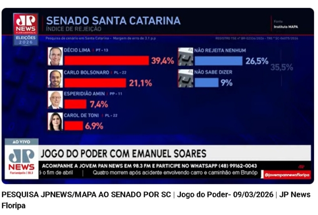 A pesquisa também revelou o nível de rejeição dos candidatos. O petista Décio Lima apresenta o maior índice, com 39,4% dos entrevistados afirmando que não votariam nele. Em seguida aparece Carlos Bolsonaro, com 21,1%. Esperidião Amin tem 7,4% de rejeição e Caroline de Toni registra 6,9%. Outros 26,5% disseram não rejeitar nenhum dos nomes apresentados, enquanto 9% não souberam opinar.