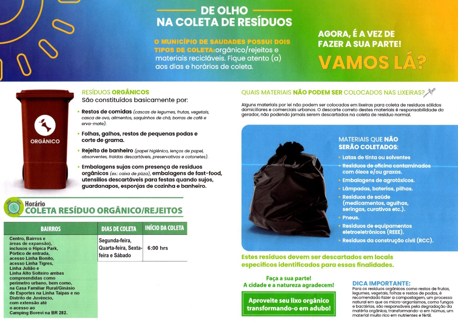 A administração municipal de Saudades está reforçando à população a importância da separação correta e da destinação adequada dos resíduos sólidos, destacando os dias e horários estabelecidos para a coleta de lixo orgânico e de materiais recicláveis no município.