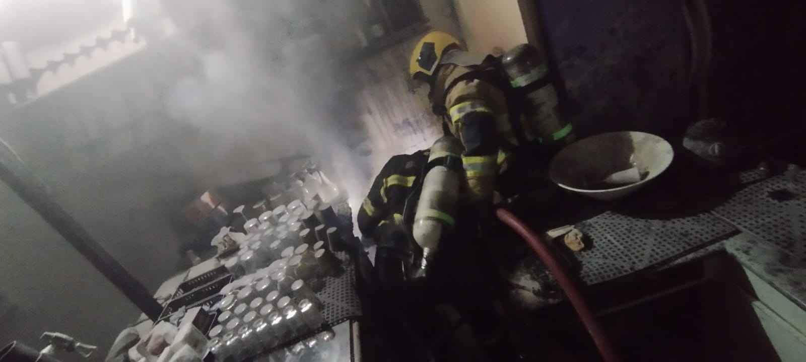 As chamas foram controladas com o uso de aproximadamente 500 litros de água, empregados na extinção e no resfriamento da área atingida. Após o controle do incêndio, o ambiente permaneceu ventilado e desenergizado.