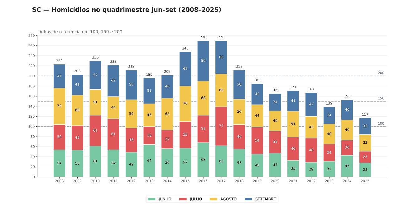 Os números de homicídios registrados em Santa Catarina entre junho e setembro de 2025 representam o melhor resultado para esses meses em quase duas décadas. O levantamento da Diretoria de Inteligência Estratégica (DINE), da Secretaria de Estado da Segurança Pública (SSP-SC), mostra que o Estado mantém uma trajetória consistente de redução da criminalidade, consolidando o primeiro semestre com o menor índice de homicídios já registrado na série histórica.