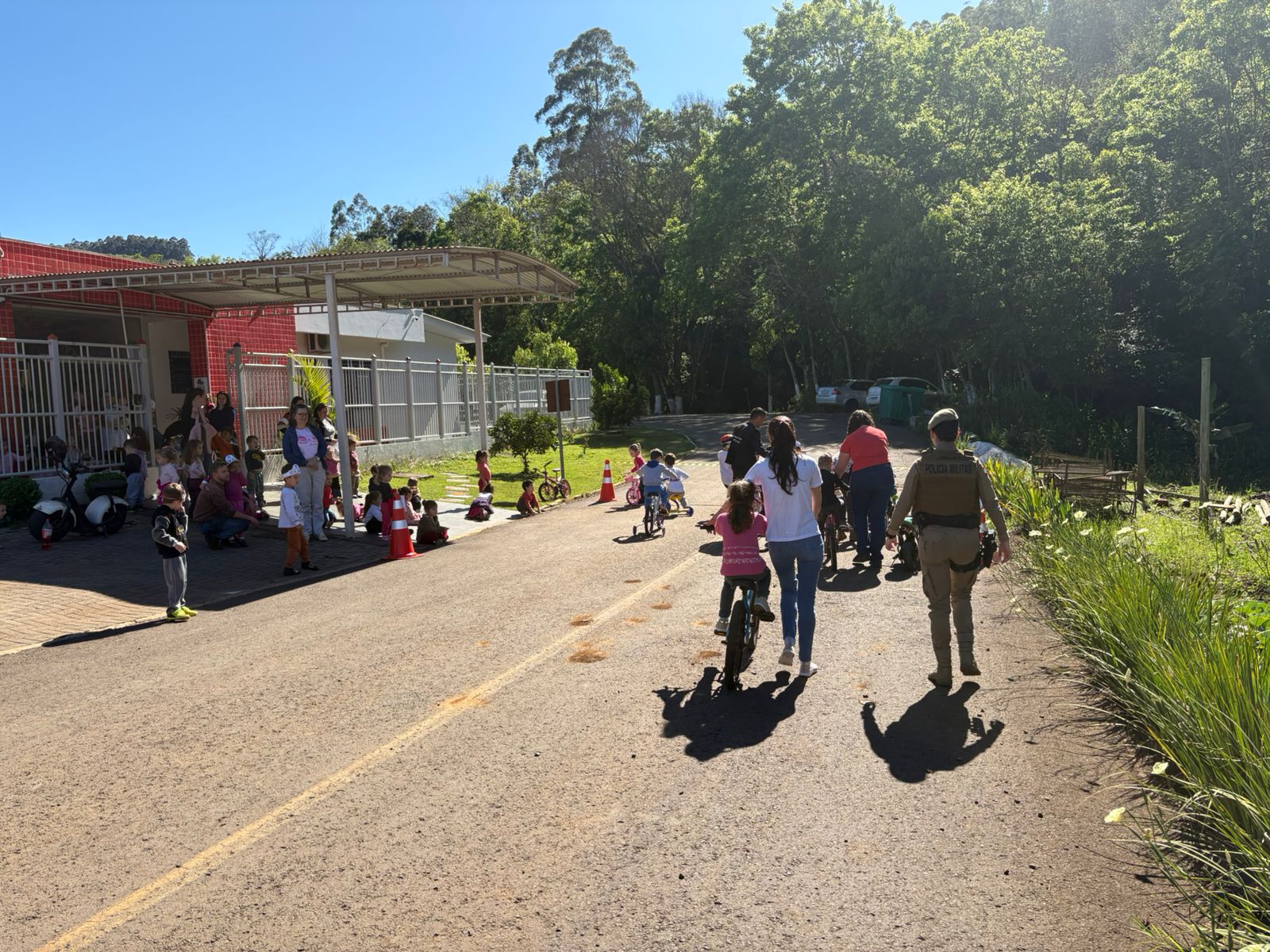 O momento mais marcante ocorreu na última quinta-feira (25), em alusão ao Dia do Trânsito, quando a policial militar Aline participou das atividades, levando orientações práticas às ruas. Em um animado “bicicletaço”, as crianças puderam identificar placas, sinais e faixas de pedestres, vivenciando a importância do respeito às normas de trânsito de forma divertida e educativa.