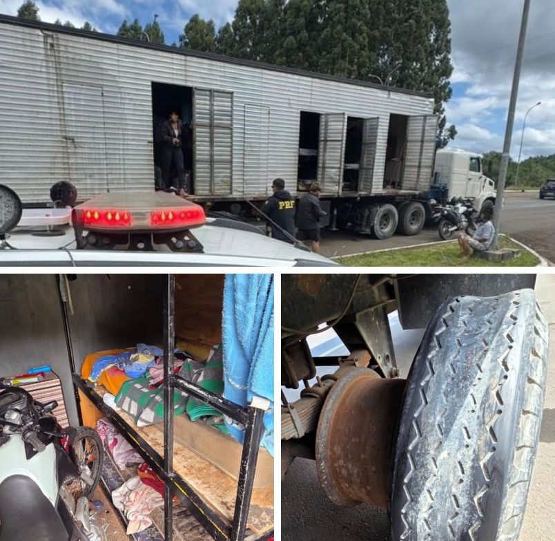 Na manhã desta segunda-feira (23), policiais rodoviários federais flagraram seis pessoas sendo transportadas de forma irregular dentro do compartimento de carga de um caminhão na BR-282, em Campos Novos, Oeste de Santa Catarina.