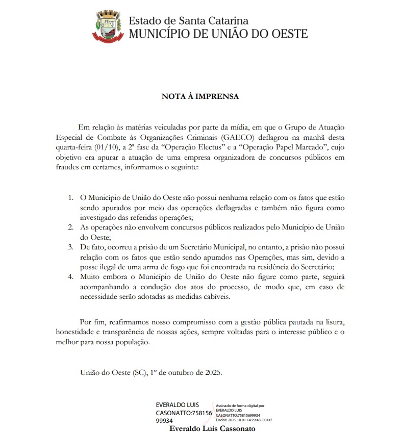 A nota, assinada pelo prefeito Everaldo Luis Cassonato, afirma ainda que União do Oeste seguirá acompanhando o andamento do processo e adotará medidas cabíveis caso necessário.